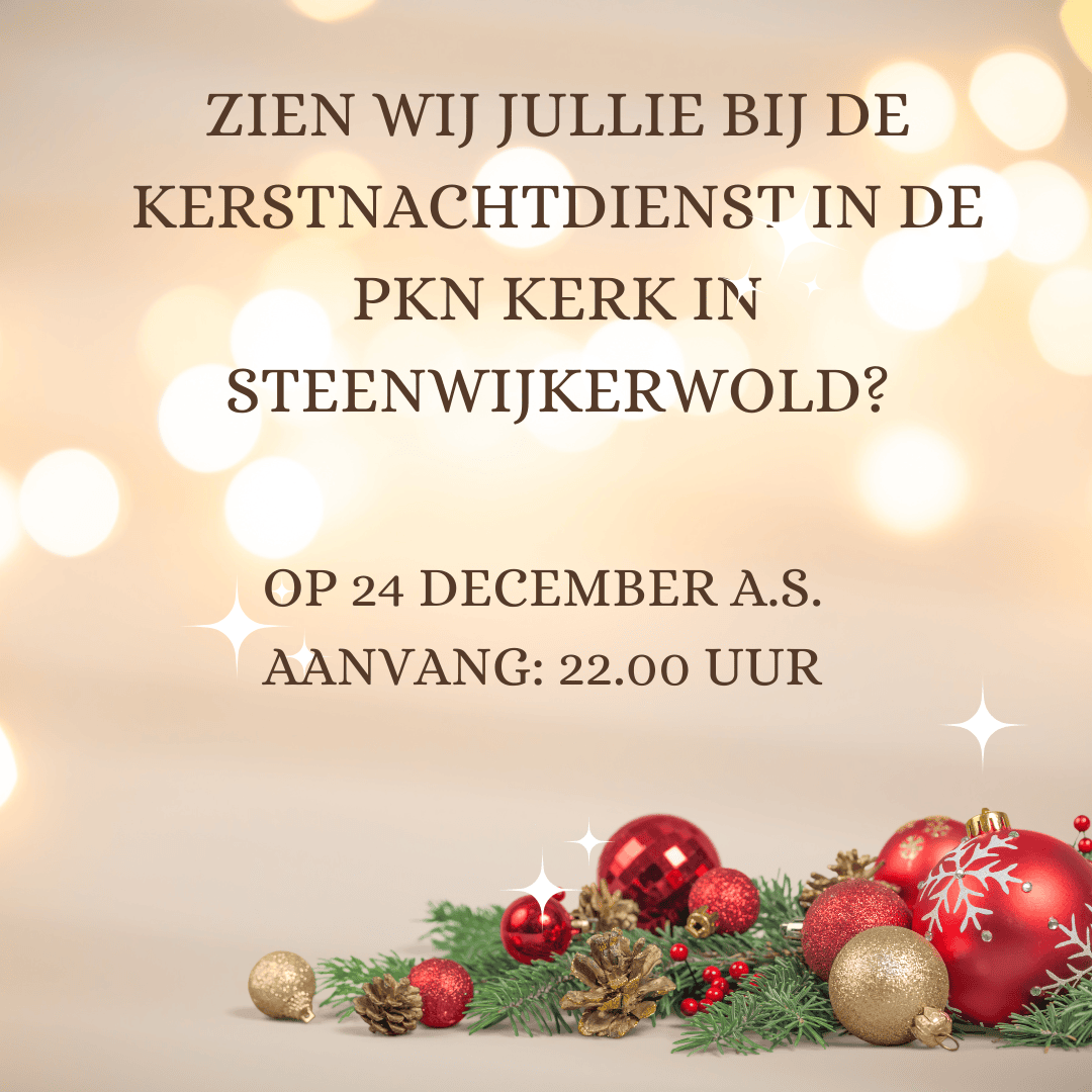 Op kerstavond (24 december 2025) werken wij mee aan de kerstnachtdienst in de PKN Kerk in Steenwijkerwold. De dienst begint om 22:00. Wij zorgen dat de liederen die wij zingen er goed in zitten en hopen zo een mooie bijdrage te kunnen leveren aan deze speciale dienst